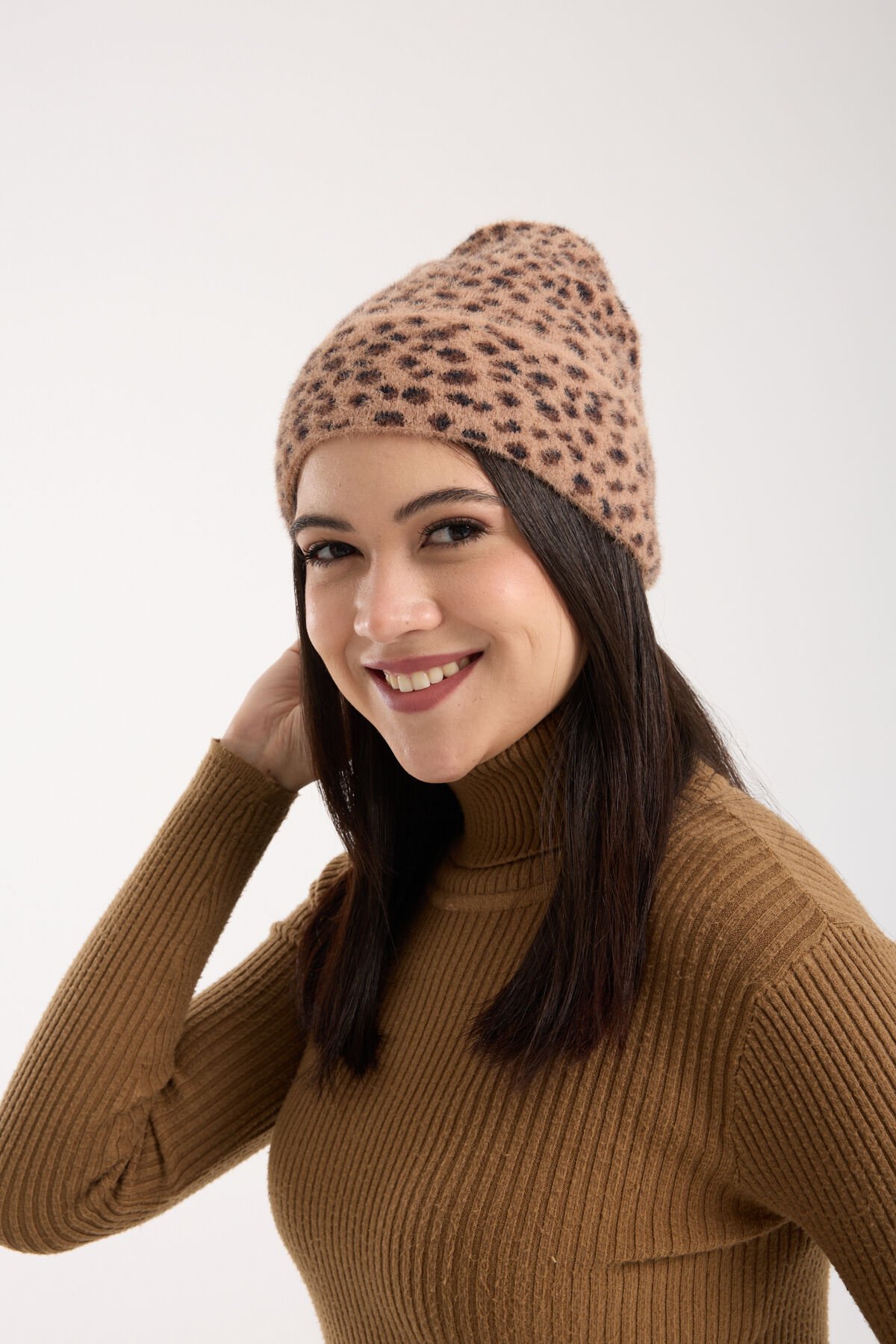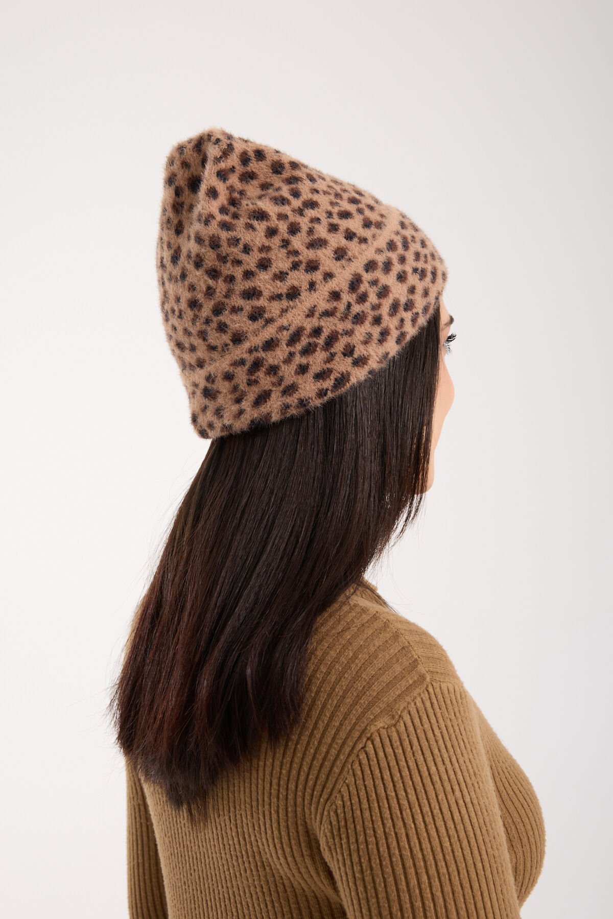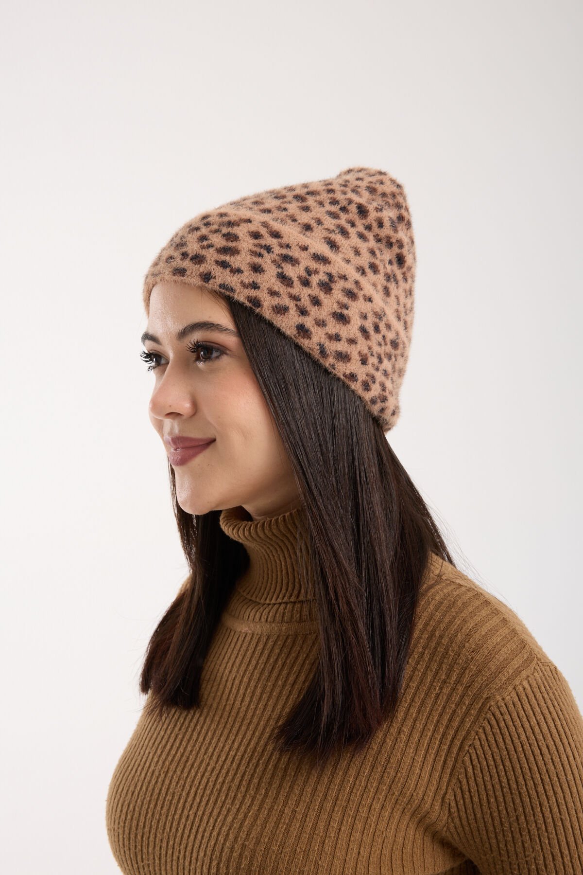 Bej Leopar Desenli Peluş Katlamalı Bere