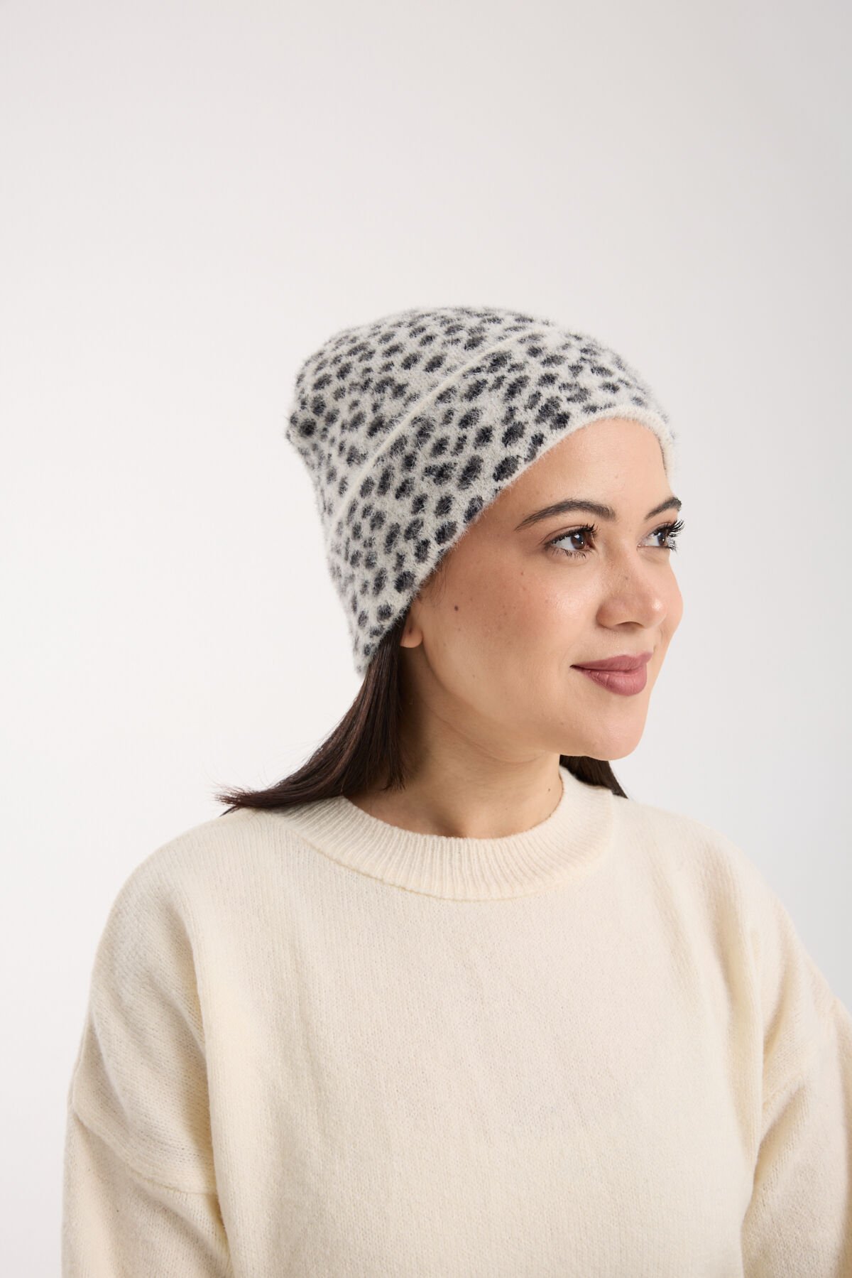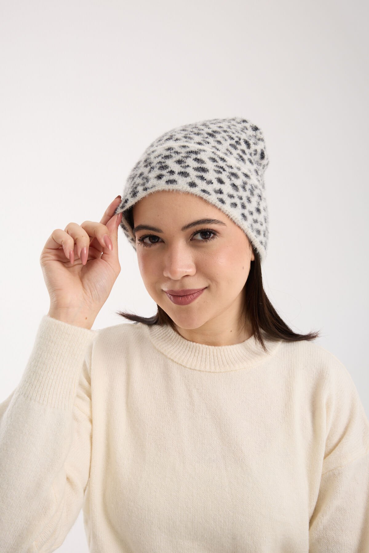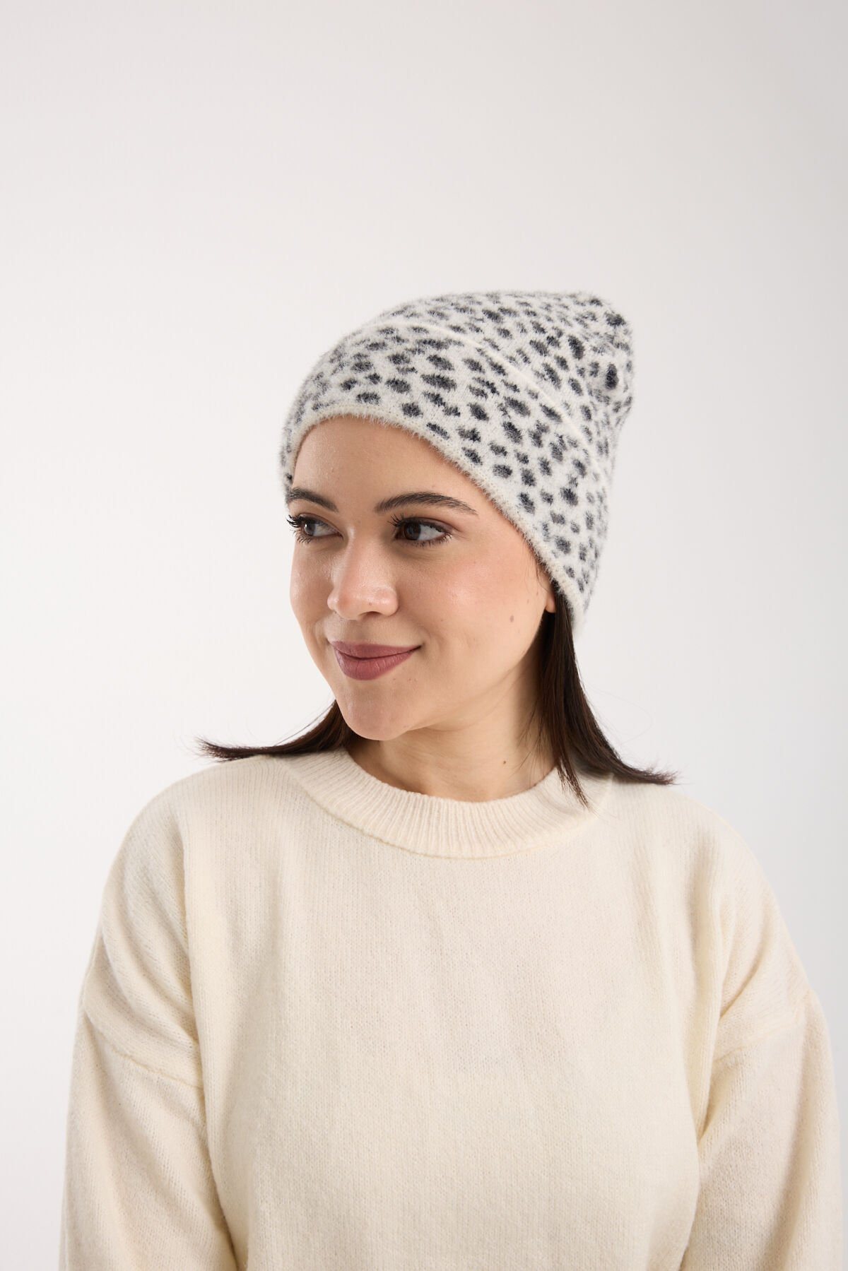 Beyaz Leopar Desenli Peluş Katlamalı Bere