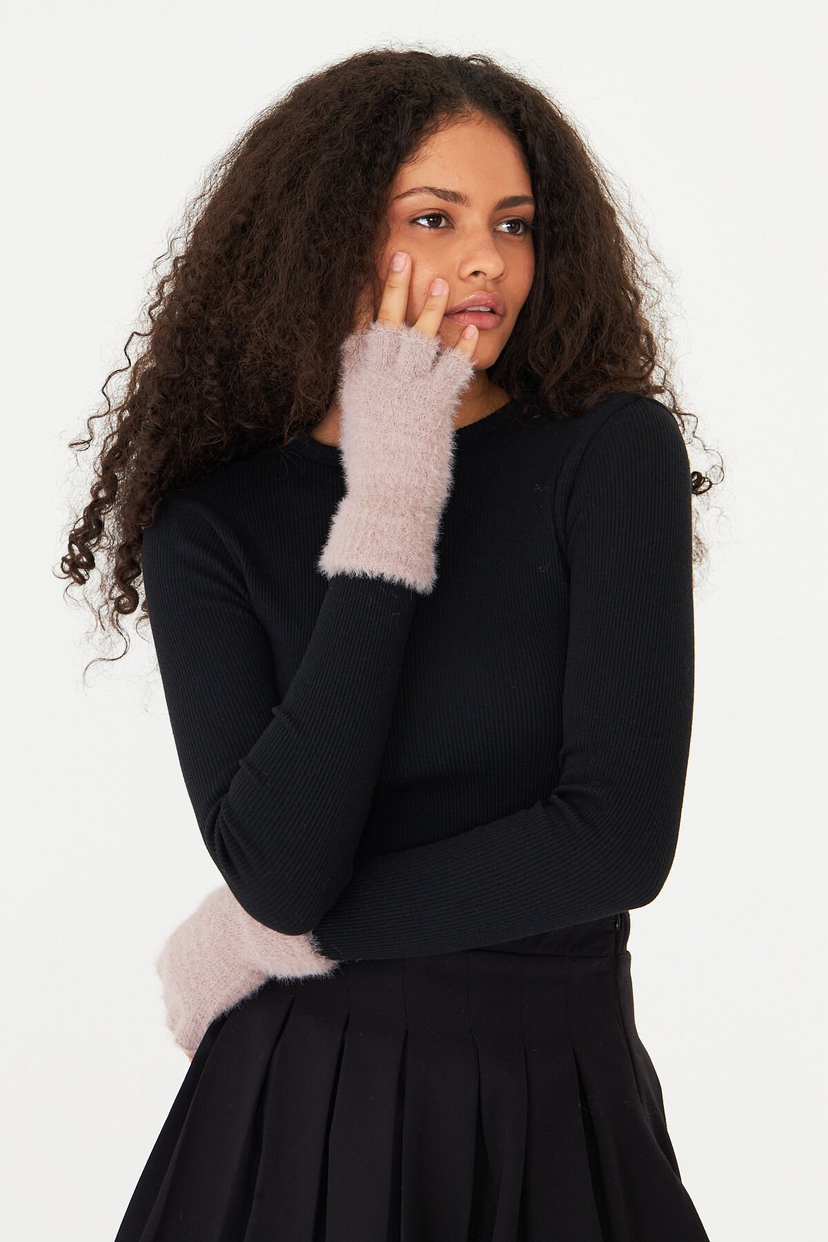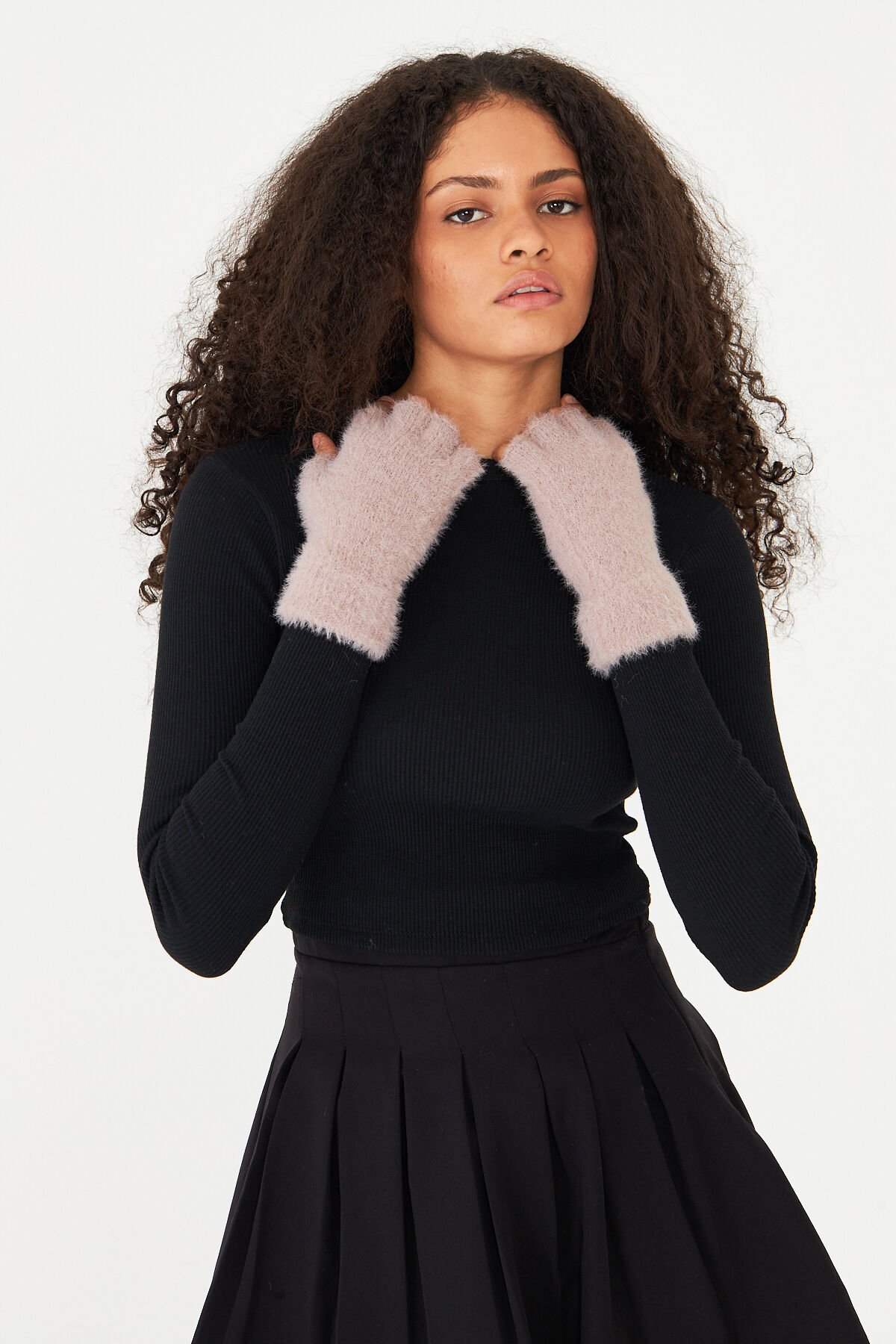 Yumuşak dokusuyla cildinize nazikçe dokunan siyah peluş eldiven, soğuk havalarda ellerinizi sıcak tutar.
