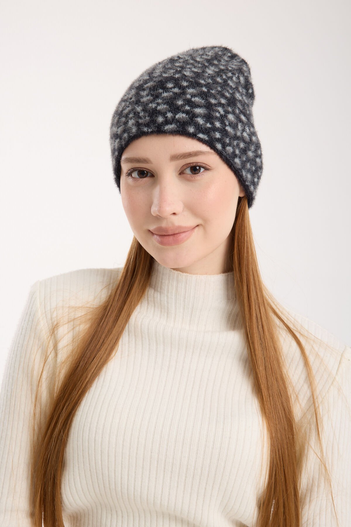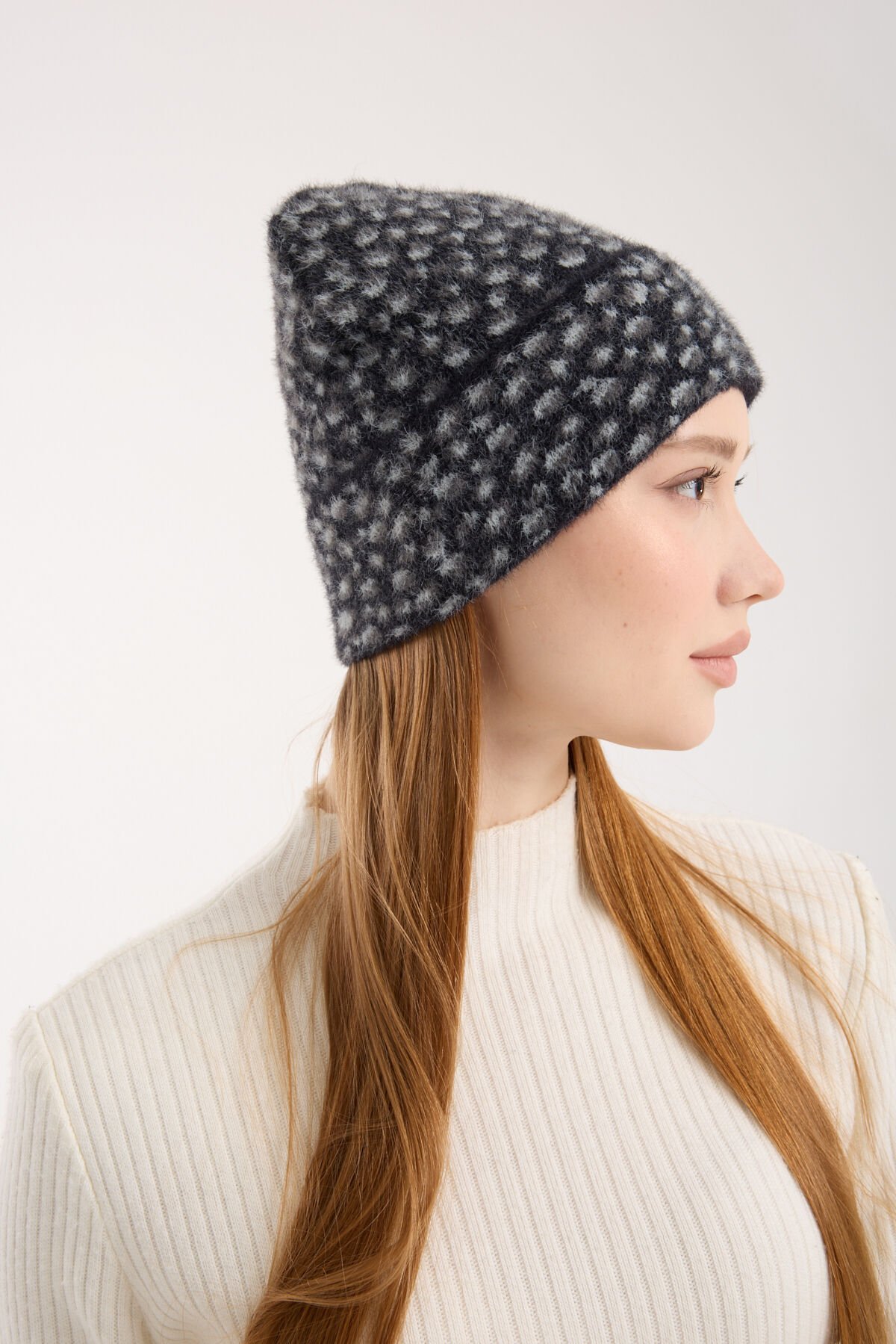 Siyah Leopar Desenli Peluş Katlamalı Bere
